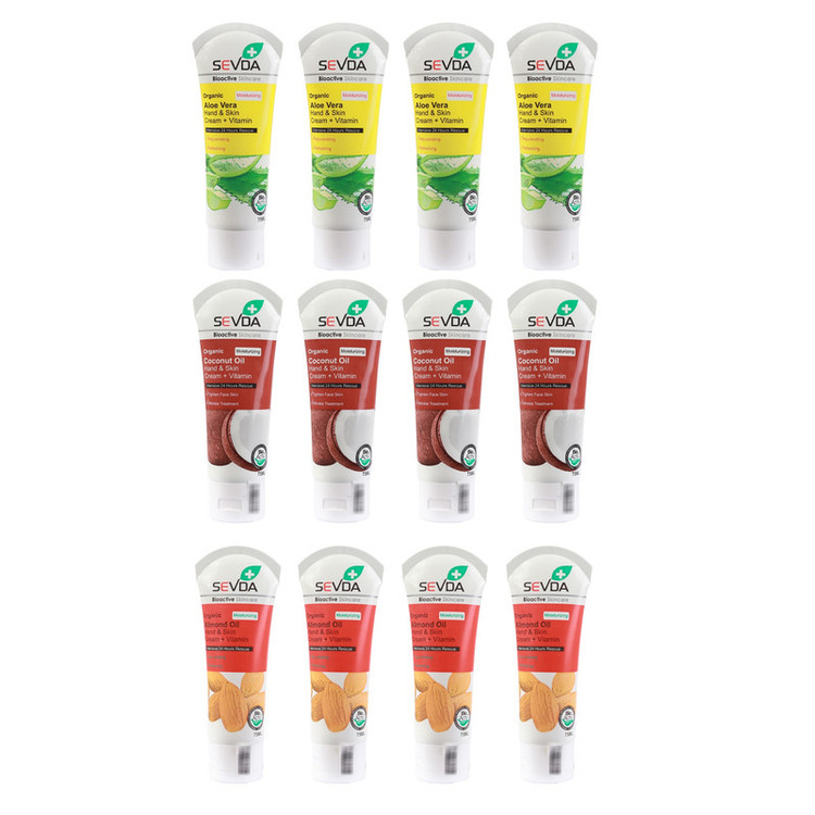 کرم مرطوب‌کننده دست، صورت سودا مدل بادام و آلوئه ورا و نارگیل مناسب برای انواع پوست حجم 75 میلی‌لیتر مجموعه 12 عددی