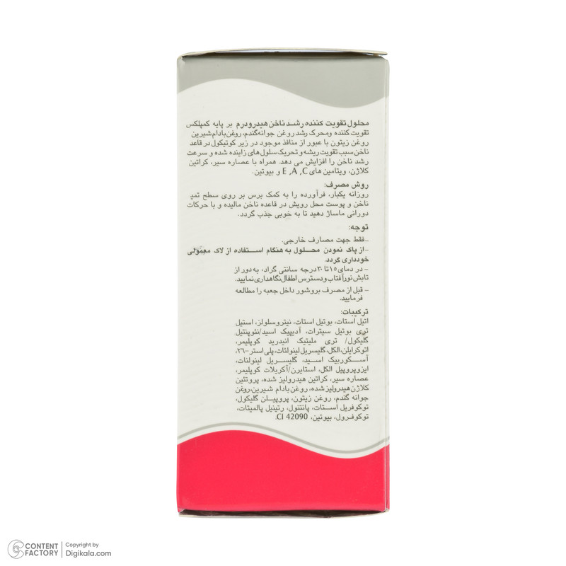 - تحریک کننده سلول های زاینده ناخن - تقویت کننده ریشه ناخن - تسریع کننده رشد ناخن - حاوی کمپلکس تقویت کننده و محرک رشد متیونین، روغن جوانه گندم، روغن بادام شیرین و دسیل الیوات - همراه با ویتامین های A و E
