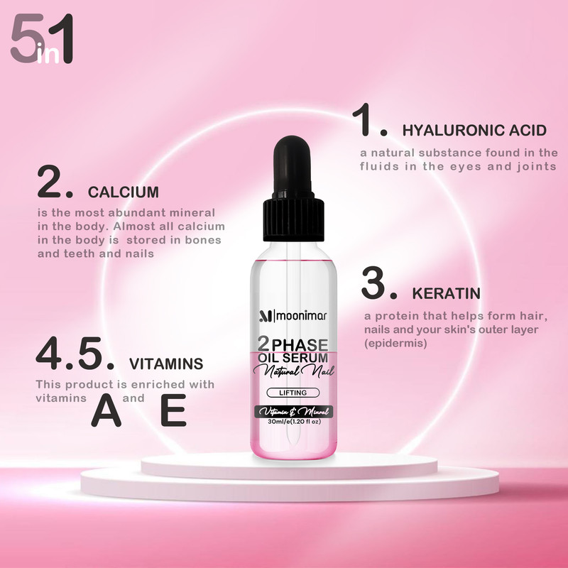 در ترکیبات این سرم از ویتامین E و A و همینطور کراتین و هیالورونیک اسید و کلسیم استفاده شده است، این سرم تسریع کننده و تقویت کننده ناخن میباشد. باتوجه به دوفاز بودن این محصول قبل از استفاده باید چند بار تکان داده شود و بعد از آن استفاده شود.