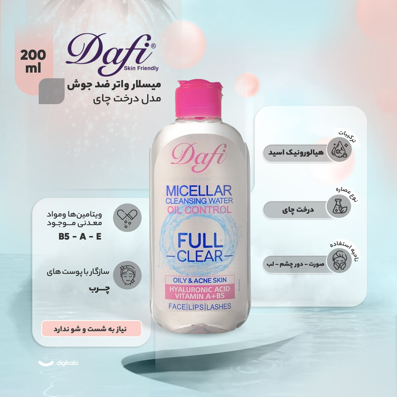میسلار واتر دافی پوست چرب، متعادلکننده ترشح چربی پوست حاوی هیالورونیک اسید و رطوبترسانی عمیق به پوست دارای روغن درخت چای، ضدباکتری و ضد عفونیکننده پوست