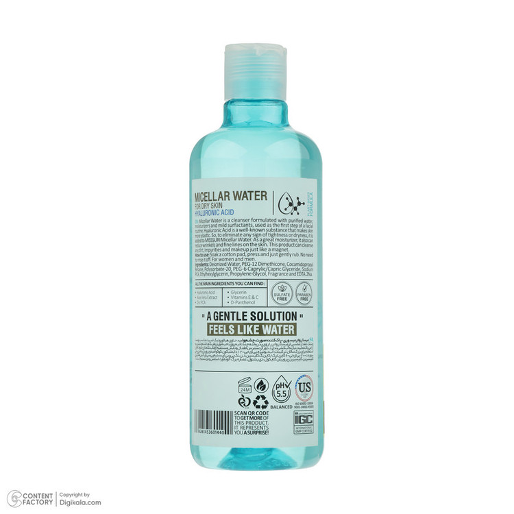 میسلار واتر میسوری مدل Hyaluronic Acid کد 02 مناسب برای پوست خشک حجم 370 میلی‌لیتر