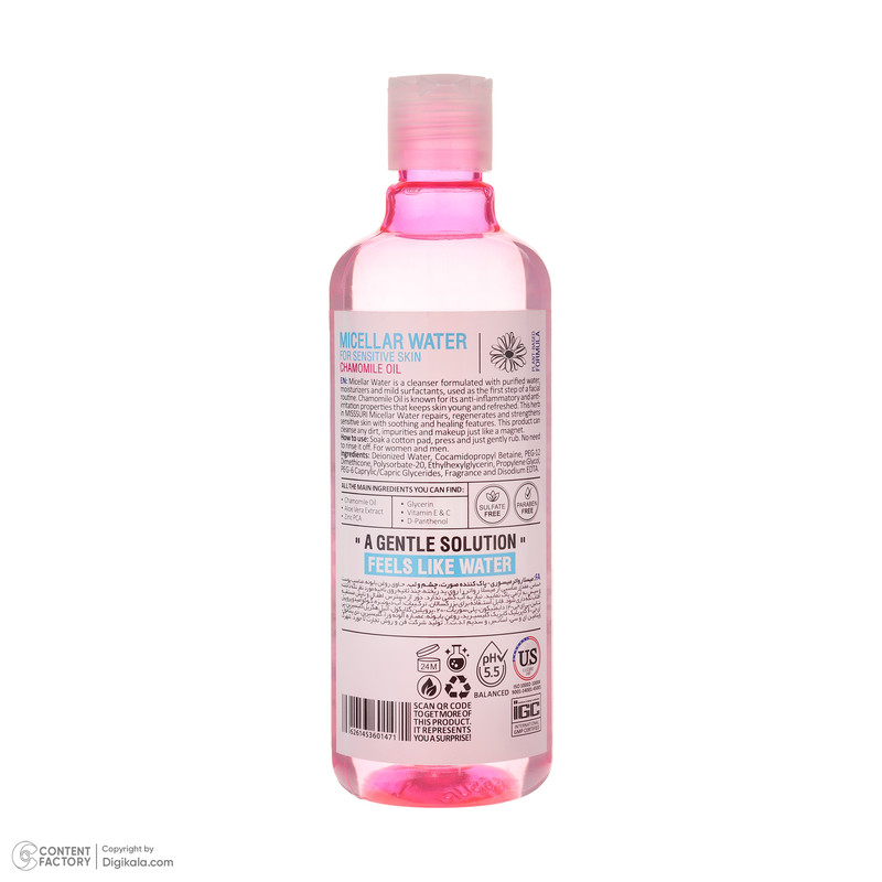 راهنمای استفاده : مقدار مناسبی از میسلار واتر را بر روی پد بریزید. برای مدت 2 تا 3 ثانیه بر روی چشم، لب و یا صورت نگه دارید و سپس به آرامی بر روی پوست بکشید تا تمیز شود.