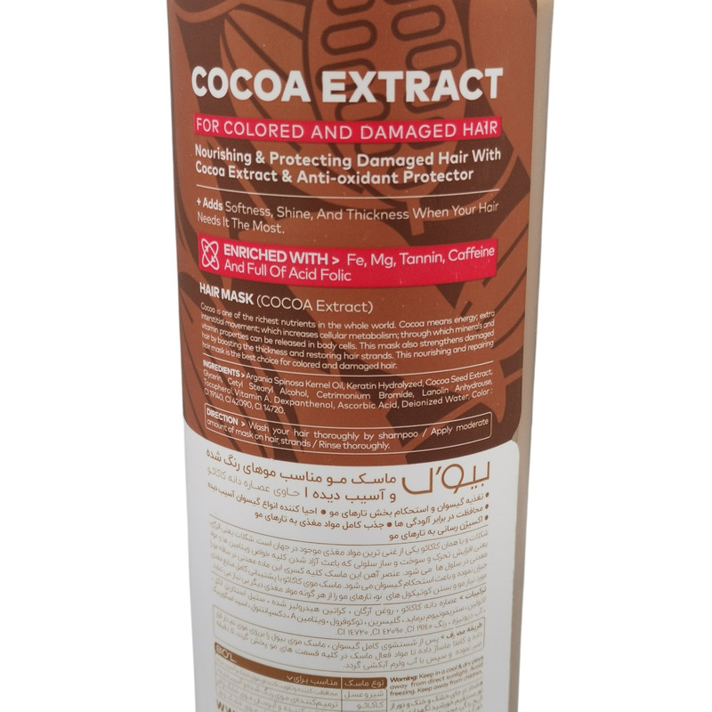 دارای آهن، پتاسیم و مس ، عصاره کاکائو، روغن آرگان، گلیسرین، کراتین