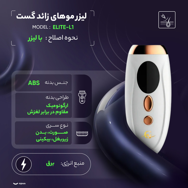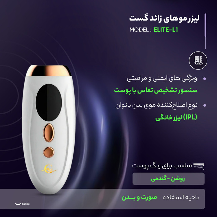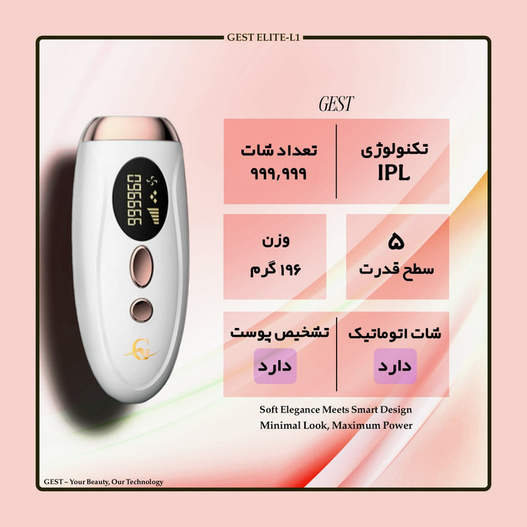 لیزر موهای زائد GEST مدل ELITE-L1 یک دستگاه قدرتمند خانگی است که با فناوری IPL (Intense Pulsed Light) طراحی شده تا حذف موهای زائد را با اثربخشی بالا، کمترین درد و ایمنی کامل انجام دهد. طراحی سبک، خوشدست و مدرن این دستگاه استفاده آسان در تمامی نواحی بدن از جمله دستها، پاها و زیر بغل را ممکن میکند. ELITE-L1 دارای ۵ سطح انرژی قابل تنظیم است تا شدت پالسهای نوری با توجه به رنگ پوست، نوع مو و حساسیت ناحیه تعیین شود و دو حالت دستی (Manual) برای نقاط حساس و خودکار (Auto) برای نواحی بزرگتر دارد. این دستگاه تنها در تماس مستقیم با پوست فعال میشود و امنیت بالایی فراهم میکند. لامپ با طول عمر بالا و تعویض رایگان هد جایگزین تا ۱۰۰,۰۰۰ شات، طول عمر دستگاه را تضمین میکند. ELITE-L1 با استفاده از قطعات با کیفیت، استانداردهای ایمنی بینالمللی و کنترل کیفیت چند مرحلهای، خروجی پالس واقعی و مؤثر ارائه میدهد که پس از چند هفته استفاده منظم نتایج آن مشهود خواهد بود. با اقلام جانبی کامل و خدمات پس از فروش، این دستگاه انتخابی مطمئن و حرفهای برای رفع موهای زائد در خانه است.