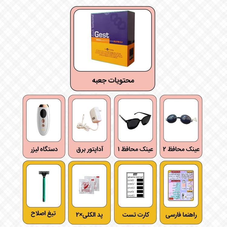 عینک محافظ چشم تابشی - عینک محافظ چشم نوری - تیغ اصلاح - پد الکلی - کارت تست کیفی - راهنما فارسی