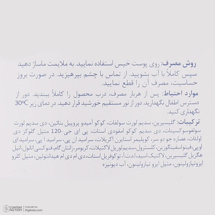 راهنمای استفاده: روی پوست خیس استفاده نمایید. به ملایمت ماساژ دهید سپس کاملا با آب بشویید. از تماس با چشم بپرهیزید. در صورت بروز حساسیت، مصرف آن را قطع نمایید.