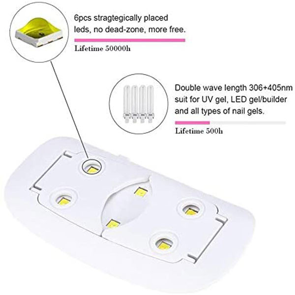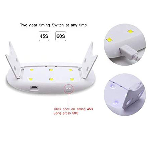 سایر مشخصات: دارای اشعه UVدارای تایمر خودکار (45 و 60 ثانیه)دارای 6 لامپ با قدرت 12 وات جهت خشک کردن مواد و ژل ناخندارای پایه های جمع شونده