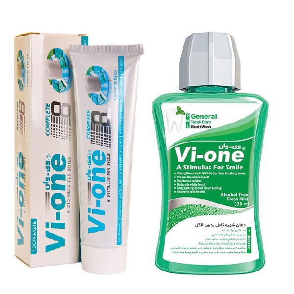 خمیر دندان وی وان مدل 8 کاره حجم 90 میلی لیتر به همراه دهانشویه وی وان حجم 330 میلی لیتر