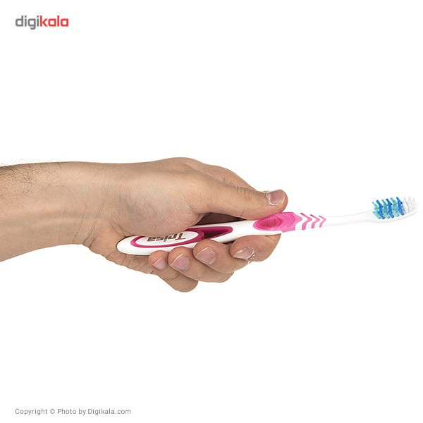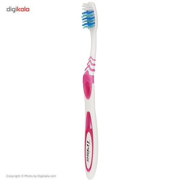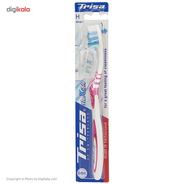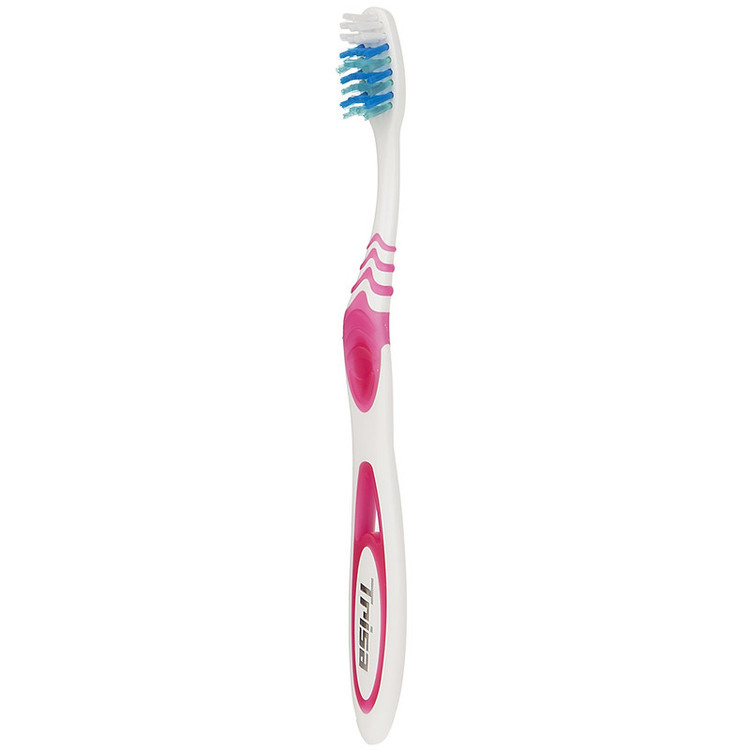 مسواک مدل «Flexible» از برند «تریزا» (Trisa) طراحی ساده و دقیقی دارد. این مسواک با دستهی ارگونومیک و راحت دارای الیافی با میزان زبری سخت است. برش لیفهای آن منطبق با آناتومی طبیعی دندانها صورت گرفته است. ویژگی این مسواک وجود الیاف با دانههای آبیرنگ برای سفیدکردن دندانهاست. دستهی این مسواک به صورت موجیشکل طراحی شده که از لغزش مسواک در دست، هنگام استفاده از آن جلوگیری میکند. مسواک دارای دو ردیف الیاف بلند برای تمیزکردن نقاط بین دندانها و الیاف کوتاه برای تمیزکردن سطوح دندان است. این مسواک با طراحی ساده ولی ویژهای که دارد، انتخاب مناسبی برای تمام افراد است. مسواک تریزا در رنگهای مختلف عرضه شده و برای کل خانواده به تفکیک قابلاستفاده است. این مسواک درپوش دارد و از نفوذ باکتری جلوگیری میکند. مسواک تریزا با کیفیت خوب، انتخاب خوبی برای بزرگسالان خواهد بود.