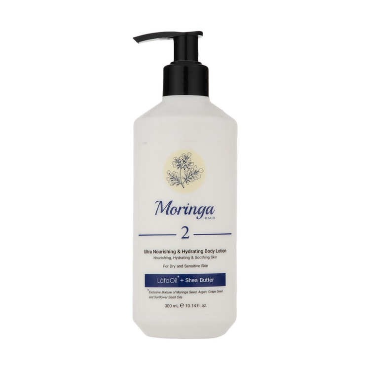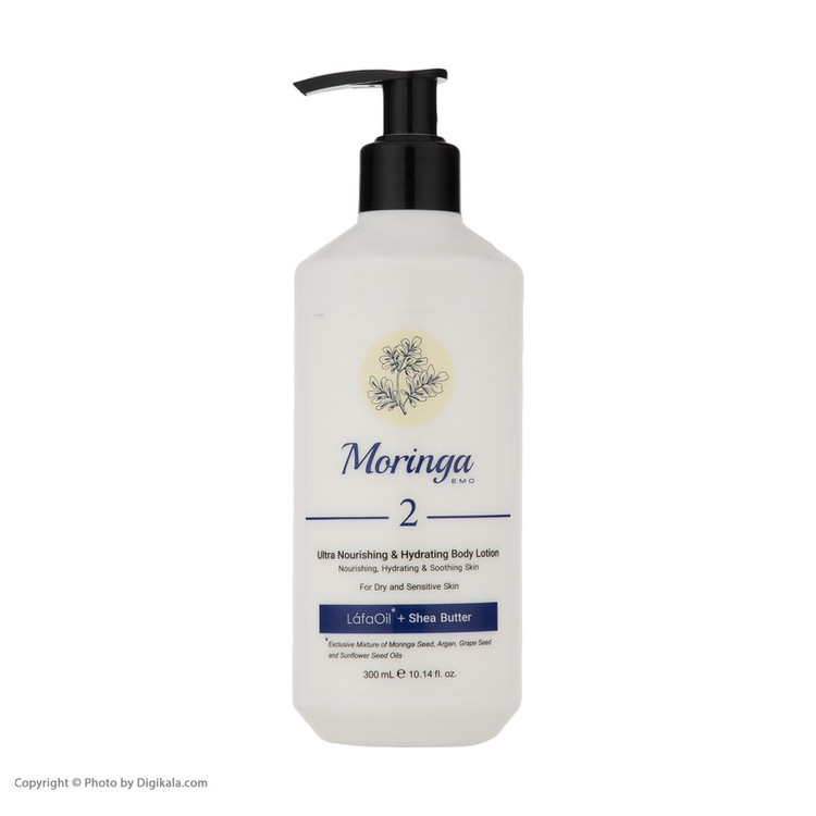 لوسیون مرطوب کننده بدن مورینگا امو مدل 02 مناسب برای پوستهای خشک و حساس حجم 300 میلیلیتر