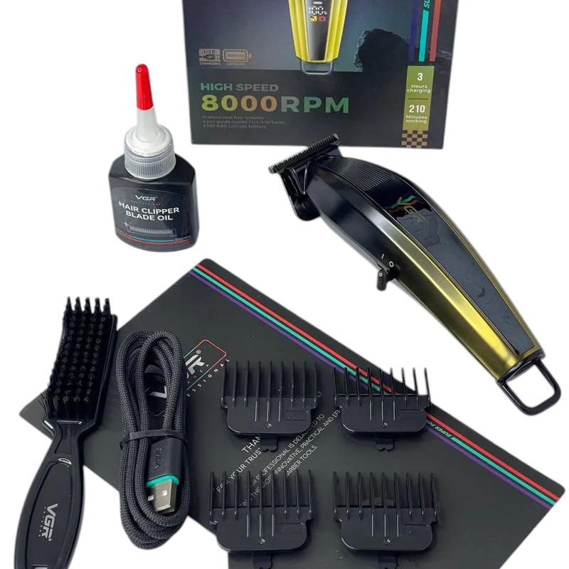 اقلام همراه : ۴ عدد شانه اصلاح ۱ ۱.۵، ۲ و ۳ میلی متر - روغن روان کننده - برس تمیز کننده - کابل شارژ