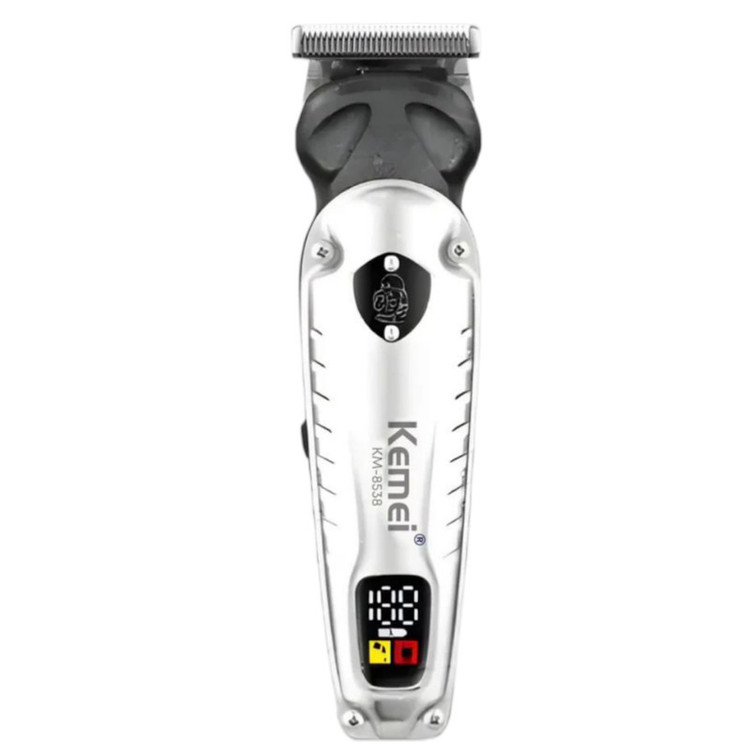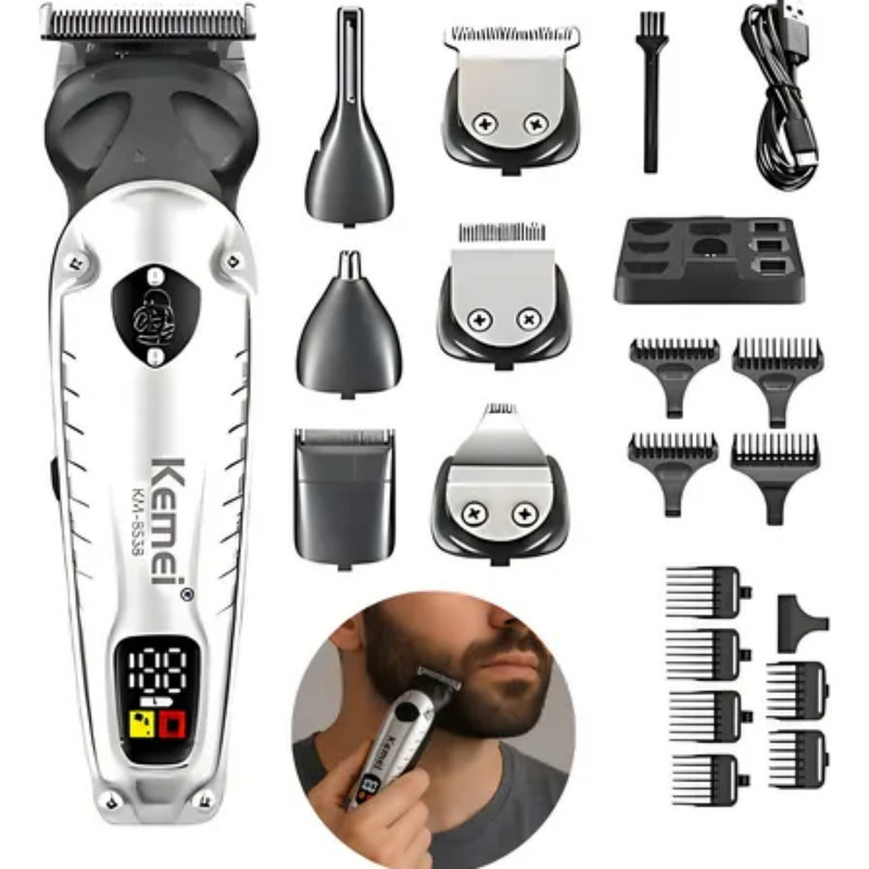 تریمر km-۸۵۳۸ ، محافظ تیغه ، 7 عدد فیش تریمر مختلف، 4عدد شانه اصلاح ۱، ۳، ۵، ۷ میلیمتر و 4عدد شانه اصلاح ۳، ۶، ۹، ۱۲ میلیمتر و ۲عدد اینچ ، کابل شارژر USB ، برس تمیز کننده