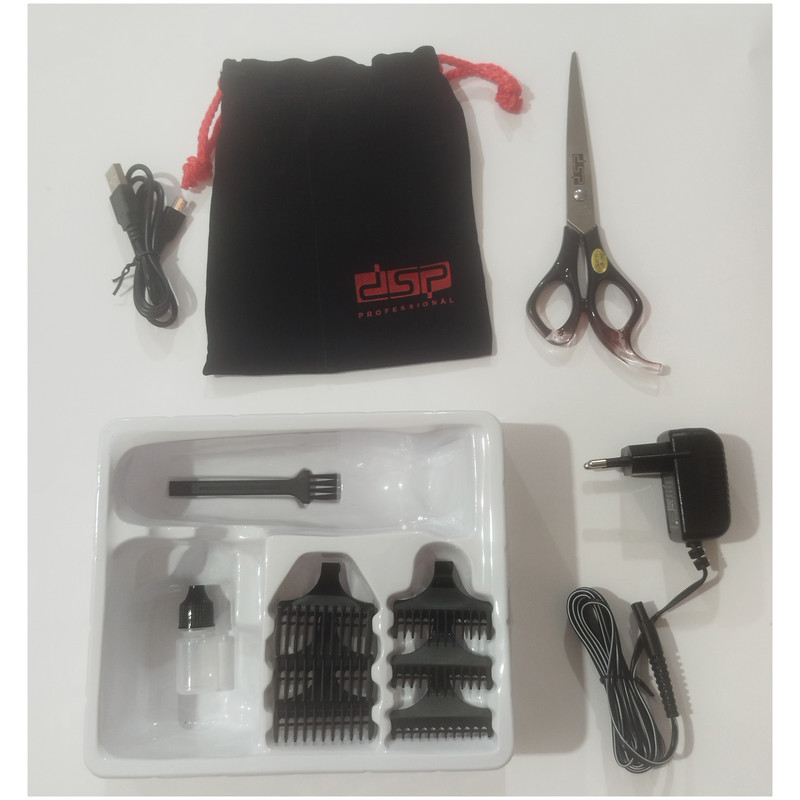 پیش بند آرایشگاهی، قیچی، کیف حمل، ست شانه 6 تایی، آداپتور، کابل USB، روغن روان کننده و برس تمیز کننده
