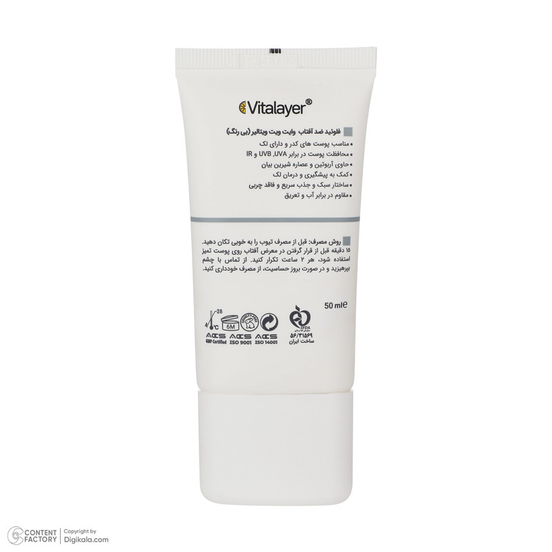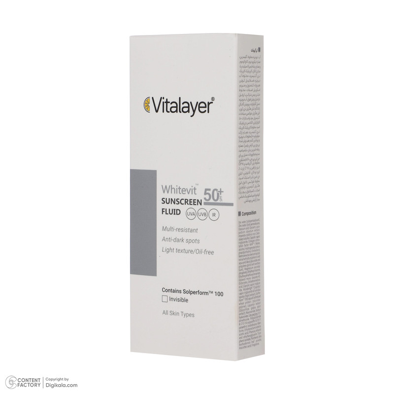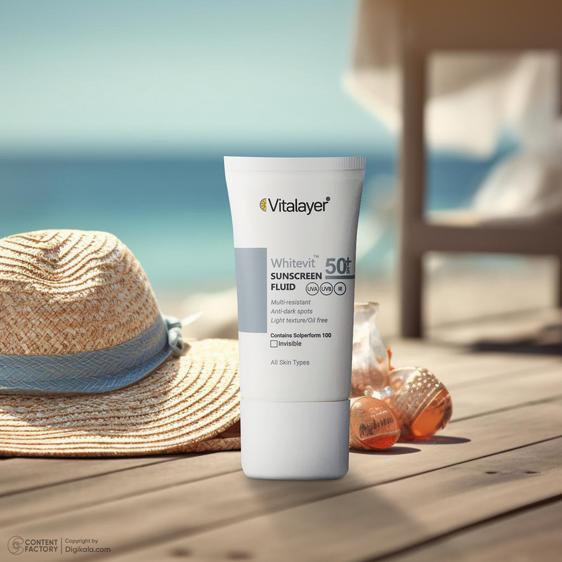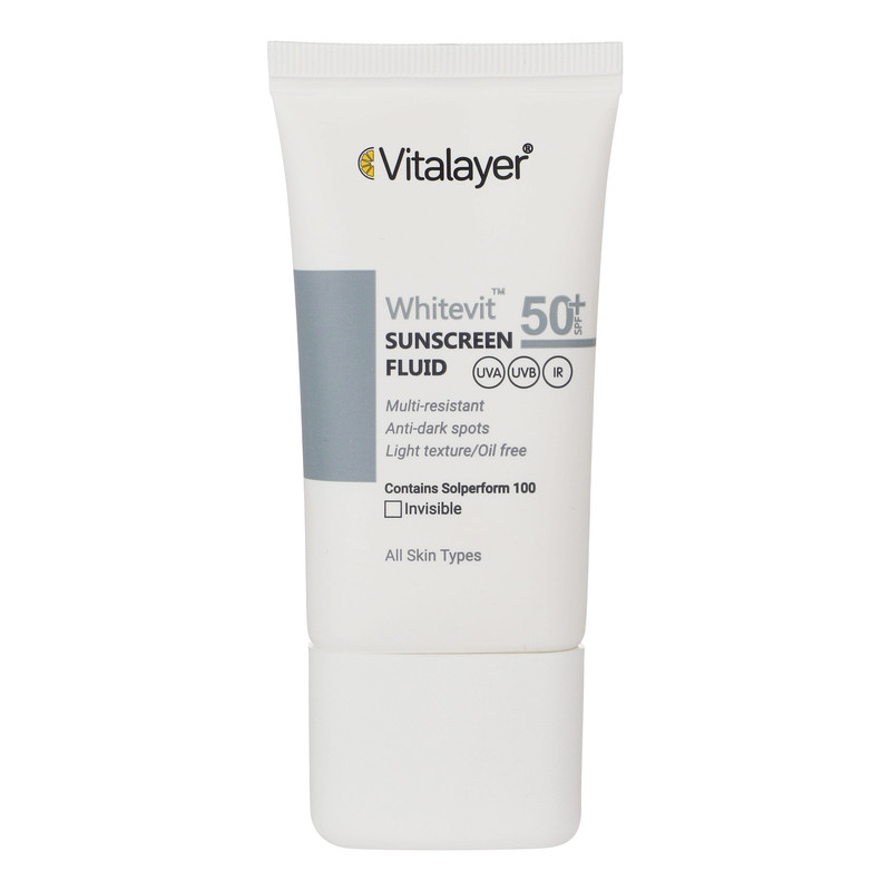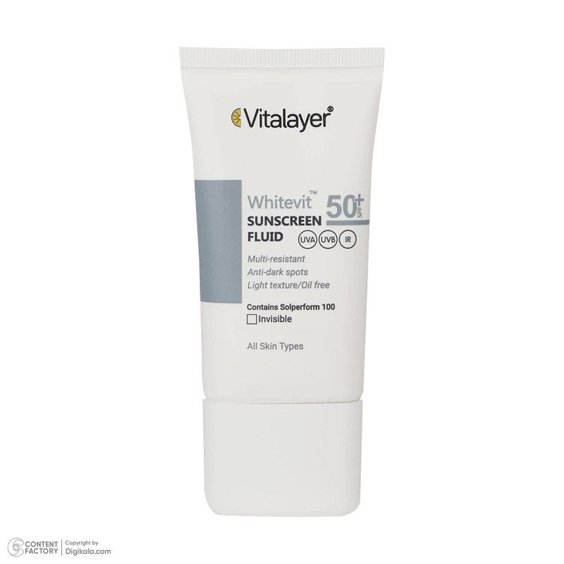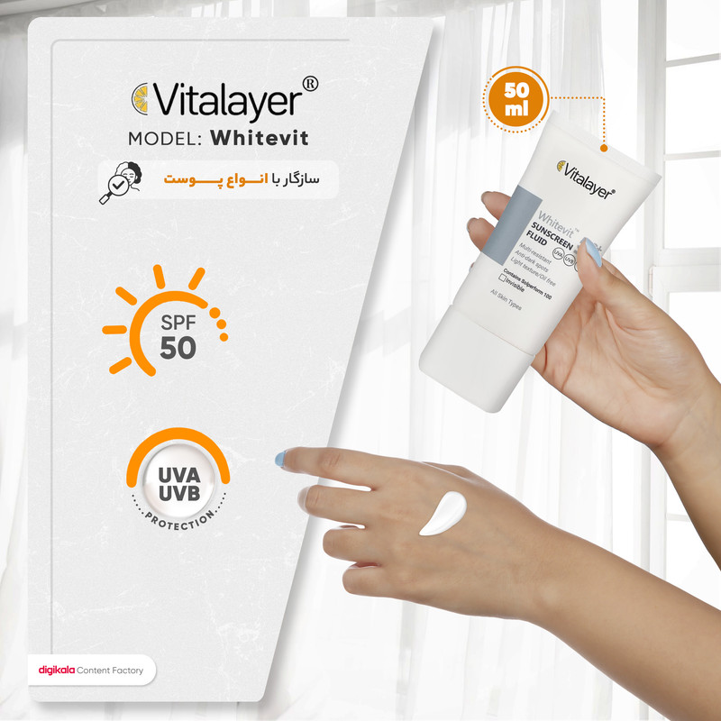 فلوئید ضدآفتاب بی‌رنگ ویتالیر SPF50 مدل Whitevit مناسب انواع پوست، حجم 50 میلی‌لیتر