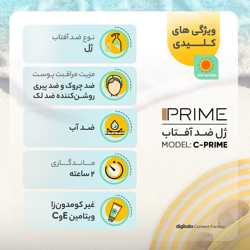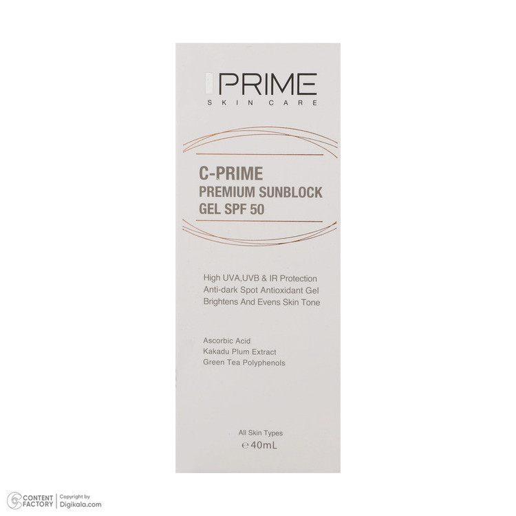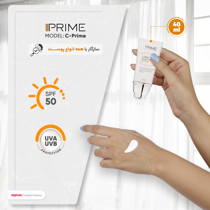 ژل ضدآفتاب بی‌رنگ پرایم SPF50 مدل C-Prime مناسب برای انواع پوست، حجم 40 میلی‌لیتر