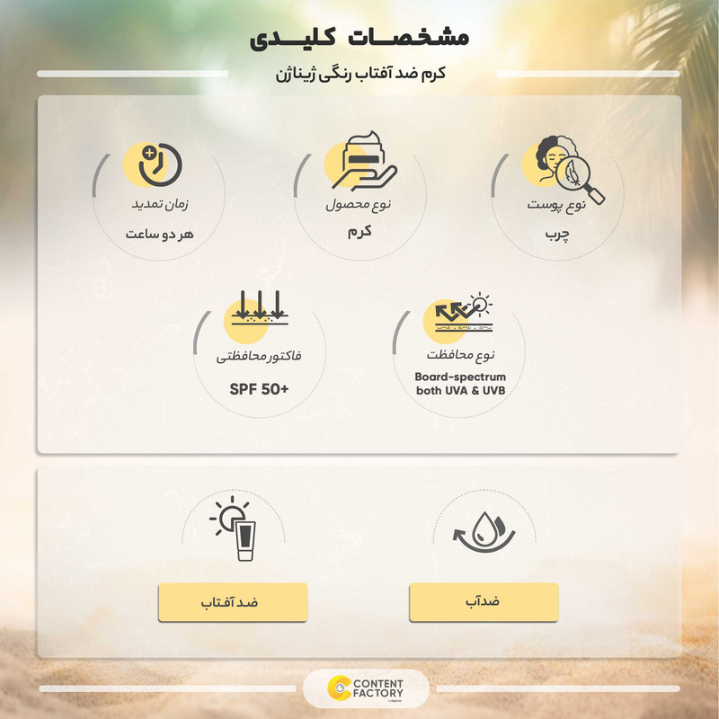 ویژگیهای ضدآفتاب : ضد آب , محافظت کننده در برابر اشعه UVA , محافظت کننده در برابر اشعه UVB