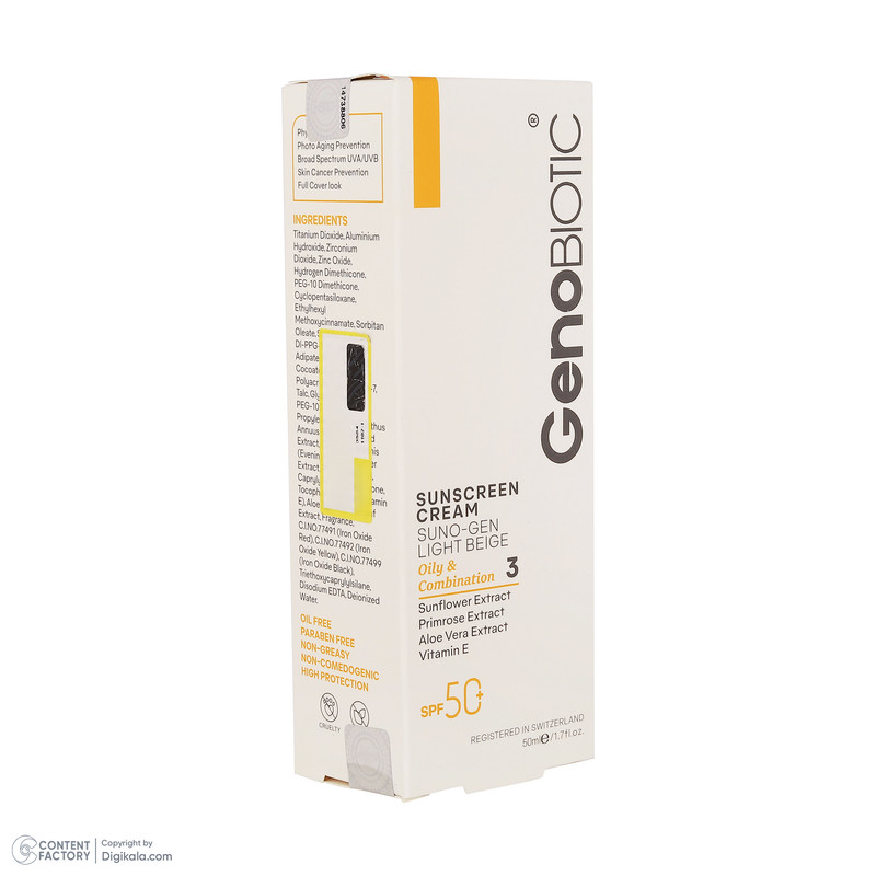 کرم ضدآفتاب رنگی ژنوبایوتیک SPF 50 مدل SUNO محافظ UVA ،UVB، مناسب پوست‌های چرب، حجم 50 میلی‌لیتر