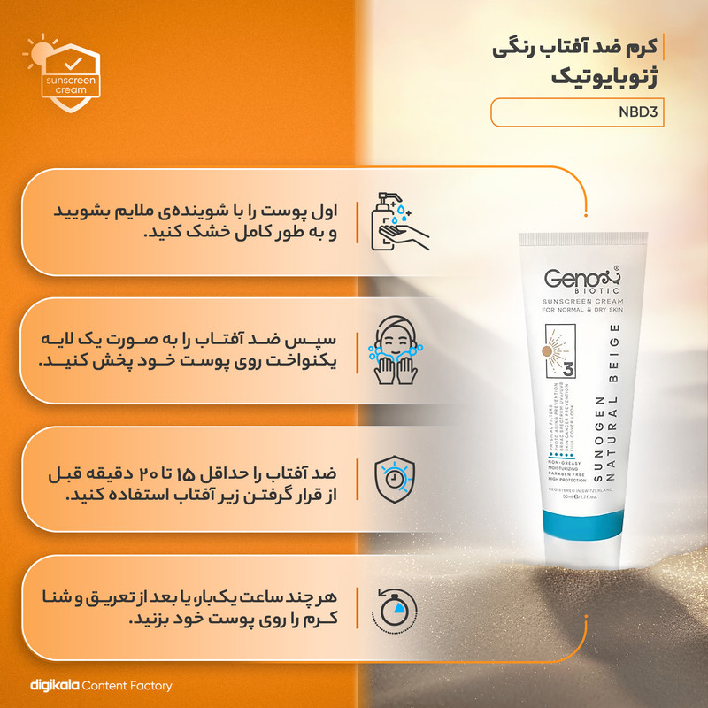 بیست دقیقه قبل از قرار گرفتن در معرض آفتاب استفاده نموده و هر 3-4 ساعت یکبار آن را تجدید نمایید.