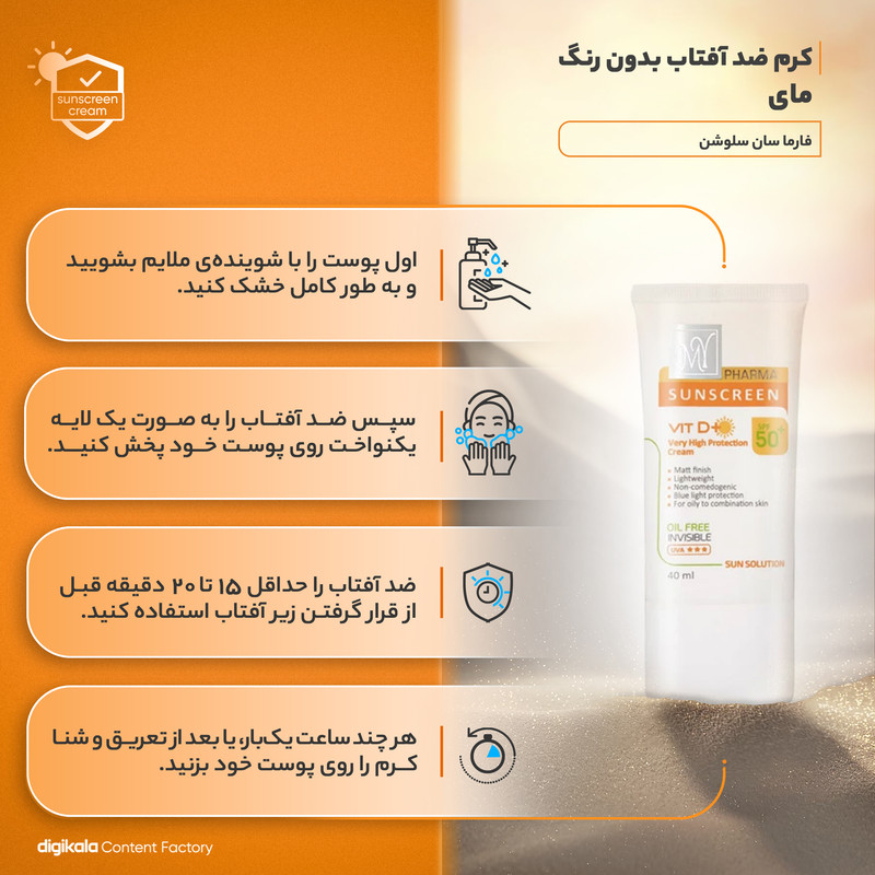 20 دقیقه قبل از قرار گرفتن در معرض آفتاب روی پوست خشک و تمیز استفاده شود و هر 2 تا 3 ساعت تکرار شود.