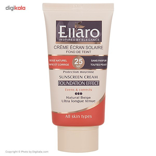 مدل «Protection Moyenne» کرم ضدآفتاب برند «الارو» (Ellaro) سری «Foundation Effect» همانطور که از نامش پیداست دارای اثر کرمپودری است که میتواند هم از پوستتان در برابر اشعههای مضر نور خورشید محافظت کند و هم کاربردی مشابه کرمپودر و آرایشی داشته باشد. رنگ کرم الارو بژ طبیعی است که برای افرادی که پوستی روشن و حتی گندمی دارند مناسب خواهد بود. ماندگاری ضدآفتاب کرمپودری الارو بالا است و این کرم فاقد پارابن و چربی است و استفاده از آن به افرادی که پوستهای چرب و مستعد جوش دارند توصیه میشود. الارو با دارا بودن SPF25 از پوست صورت در برابر اشعههای UVA و UVB محافظت میکند و مانع از آفتاب سوختگی پوست میشود. SPF25 میزان تقریباً ضعیفی نسبتبه SPFهای بالاتر محسوب میشود و بهتر است افرادی که پوست خیلی حساسی نسبتبه آفتاب ندارند از این SPF استفاده کنند. ضدآفتابهای الارو از نوع کرمپودری و معمولی در حجمها و SPFهای مختلف وجود دارند که از کیفیت بالایی برخوردارند و شما میتوانید نوعی که با پوستتان سازگارتر است را مورداستفاده قرار دهید. حجم کرم ضدآفتاب الارو چهل میلیلیتر است که در تیوپی پلاستیکی گنجانده شده است. کرم الارو دوکاره است و با کیفیت و قیمت مناسبی که دارند یک انتخاب عالی برای خانمها خواهد بود.