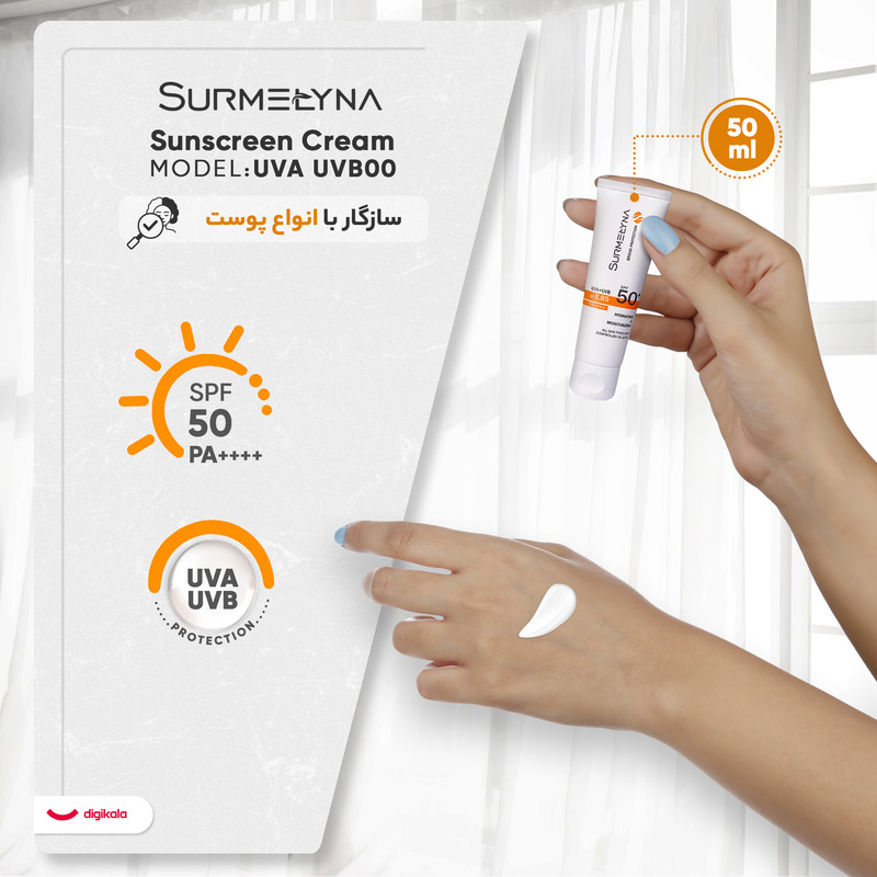 کرم ضد آفتاب بی‌رنگ سورملینا، SPF 50، مدل 00 UVA UVB، مناسب انواع پوست با حجم 50 میلی‌لیتر، ضد حساسیت، فاقد پارابن و سیلیکون، محافظت‌کننده در برابر اشعه‌های UVA و UVB، بدون تست حیوانی، PA++++، ضد پیری، ضد جوش، با ماندگاری 2 ساعته