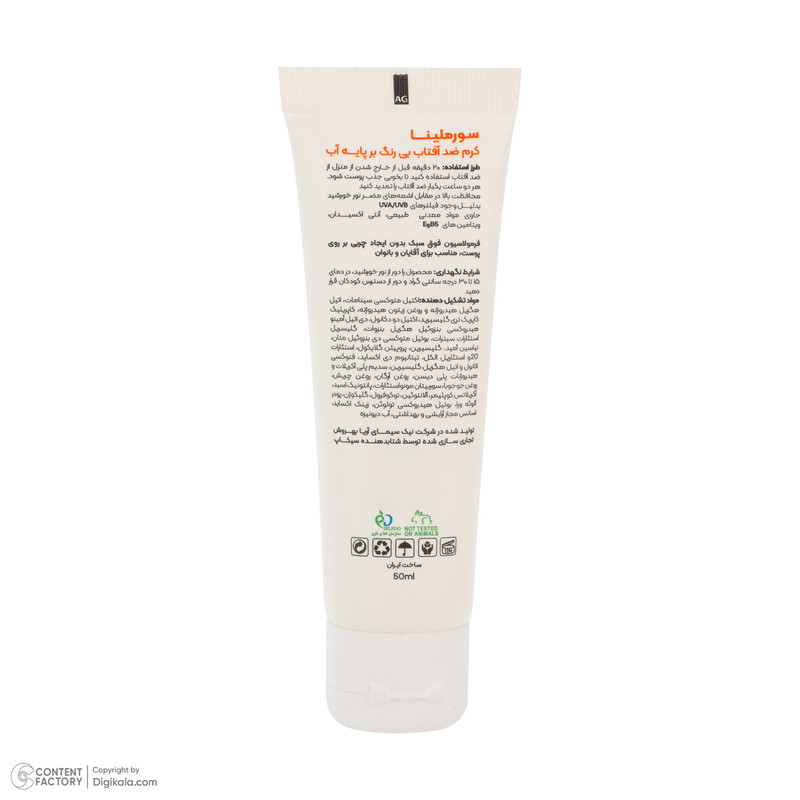 کرم ضد آفتاب بی‌رنگ سورملینا، SPF 50، مدل 00 UVA UVB، مناسب انواع پوست با حجم 50 میلی‌لیتر، ضد حساسیت، فاقد پارابن و سیلیکون، محافظت‌کننده در برابر اشعه‌های UVA و UVB، بدون تست حیوانی، PA++++، ضد پیری، ضد جوش، با ماندگاری 2 ساعته